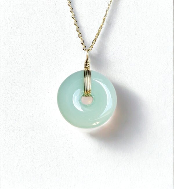Ontdek de rustgevende kracht en tijdloze elegantie van deze handgemaakte jade donut ketting, vervaardigd met 925 sterling zilver goldplated onderdelen. De zachte, mintgroene glans van jade straalt kalmte en balans uit, terwijl de ronde donutvorm staat voor harmonie, bescherming en positieve energie.