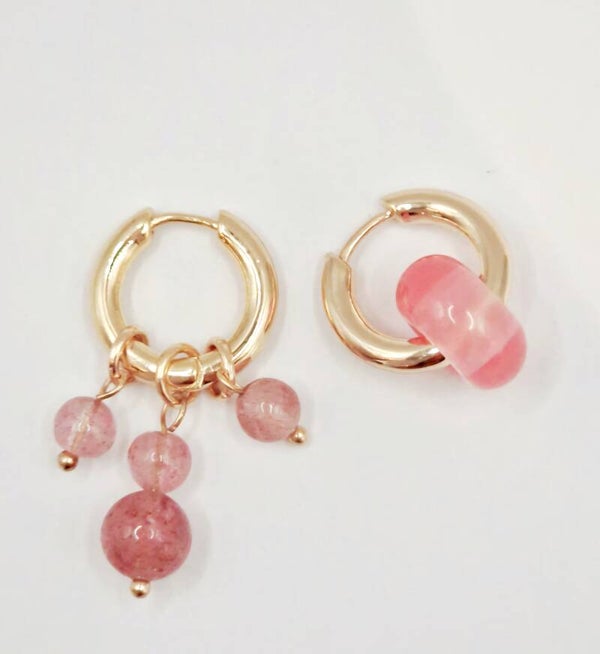 Deze elegante oorringen (⌀ 19mm) zijn gemaakt van brass (messing) en afgewerkt met een duurzame 14K gold plating. De ene oorbel is voorzien van een donutvormige rozenkwarts steen – een symbool van liefde en rust – terwijl de andere oorbel een stijlvolle hars- en steencombinatie van aardbeienkwarts kralen draagt. De totale lengte van beide oorbellen is ca. 32mm, waardoor ze opvallen zonder te overheersen.