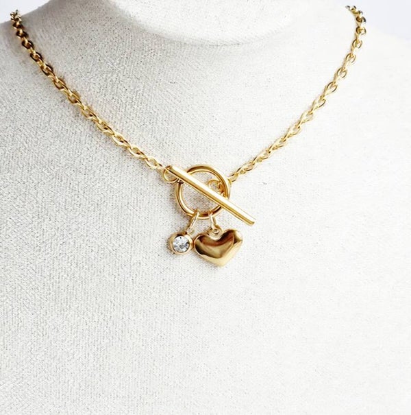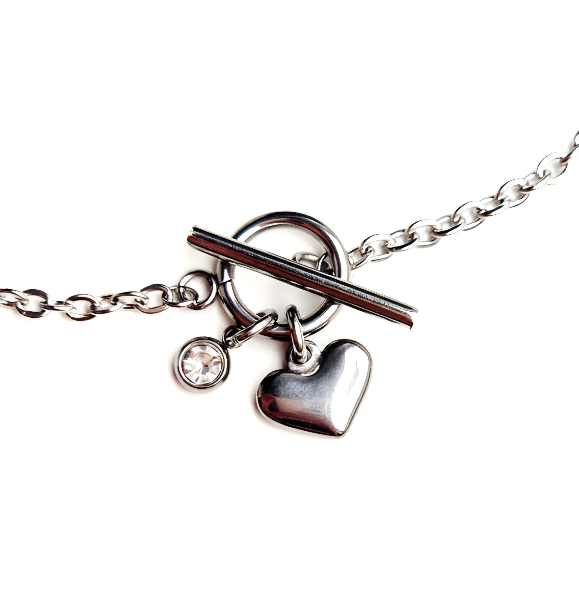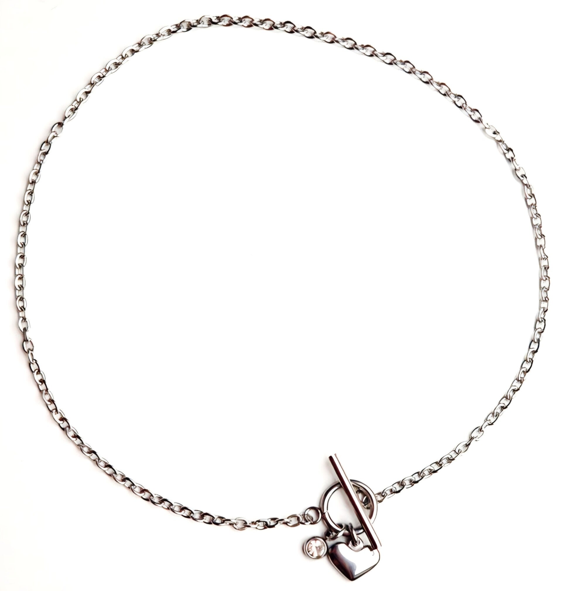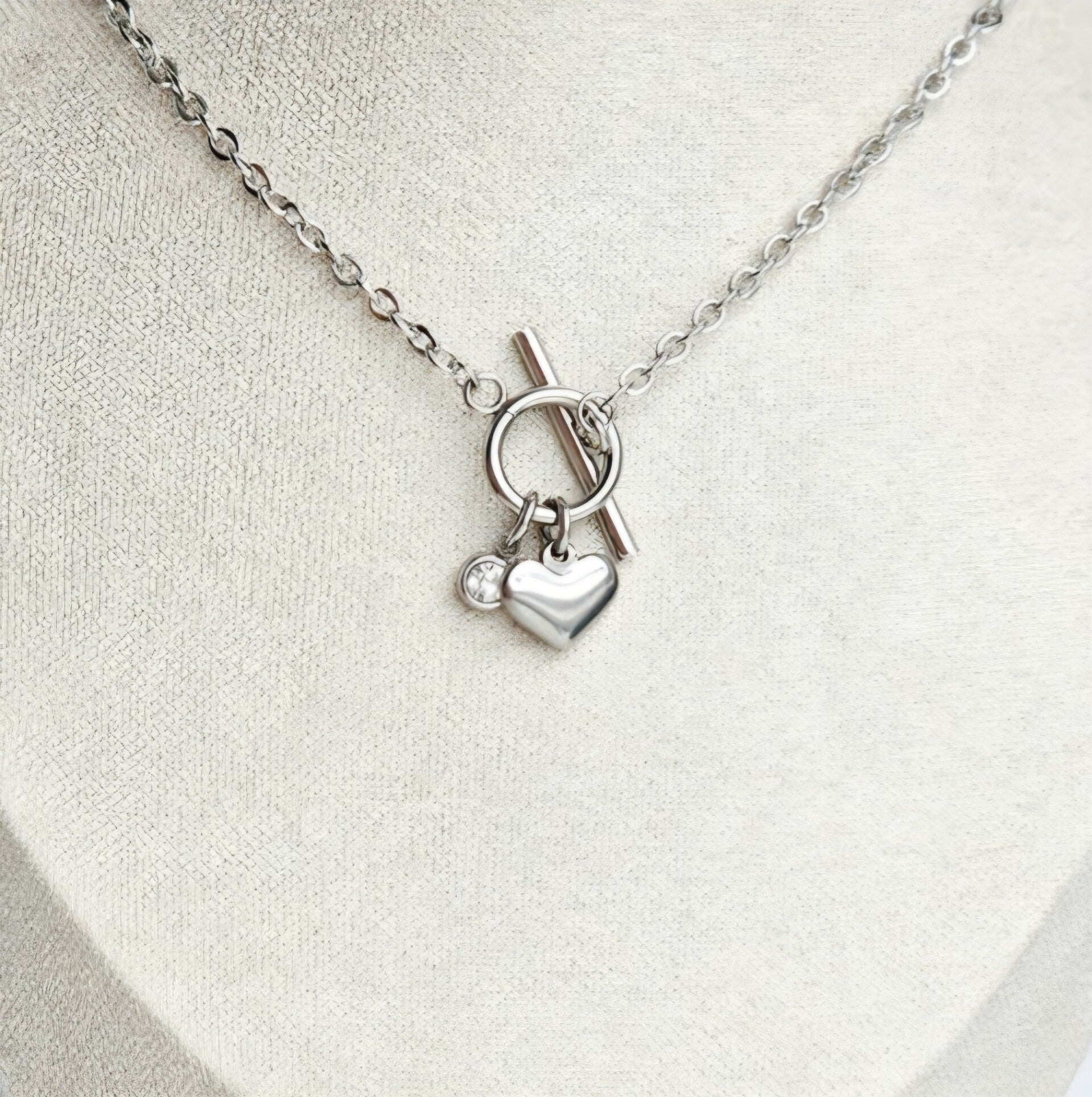 Voeg een vleugje romantische elegantie toe aan je look met deze prachtige Premium Stainless Steel ketting. De ketting heeft een subtiel hartje (12 mm) en een fonkelend kristal (4 mm), bevestigd aan een stijlvolle T-bar sluiting die het design een moderne twist geeft.