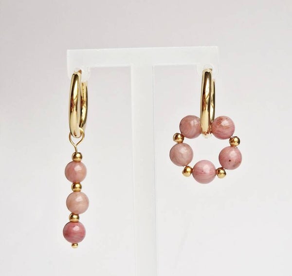 Interessant is dat het gebruikt is voor oorringen met asymmetrische hangers, waarbij de diepe, duistere roze kleur een opvallende en tegelijkertijd subtiele uitstraling aan de sieraden geeft.