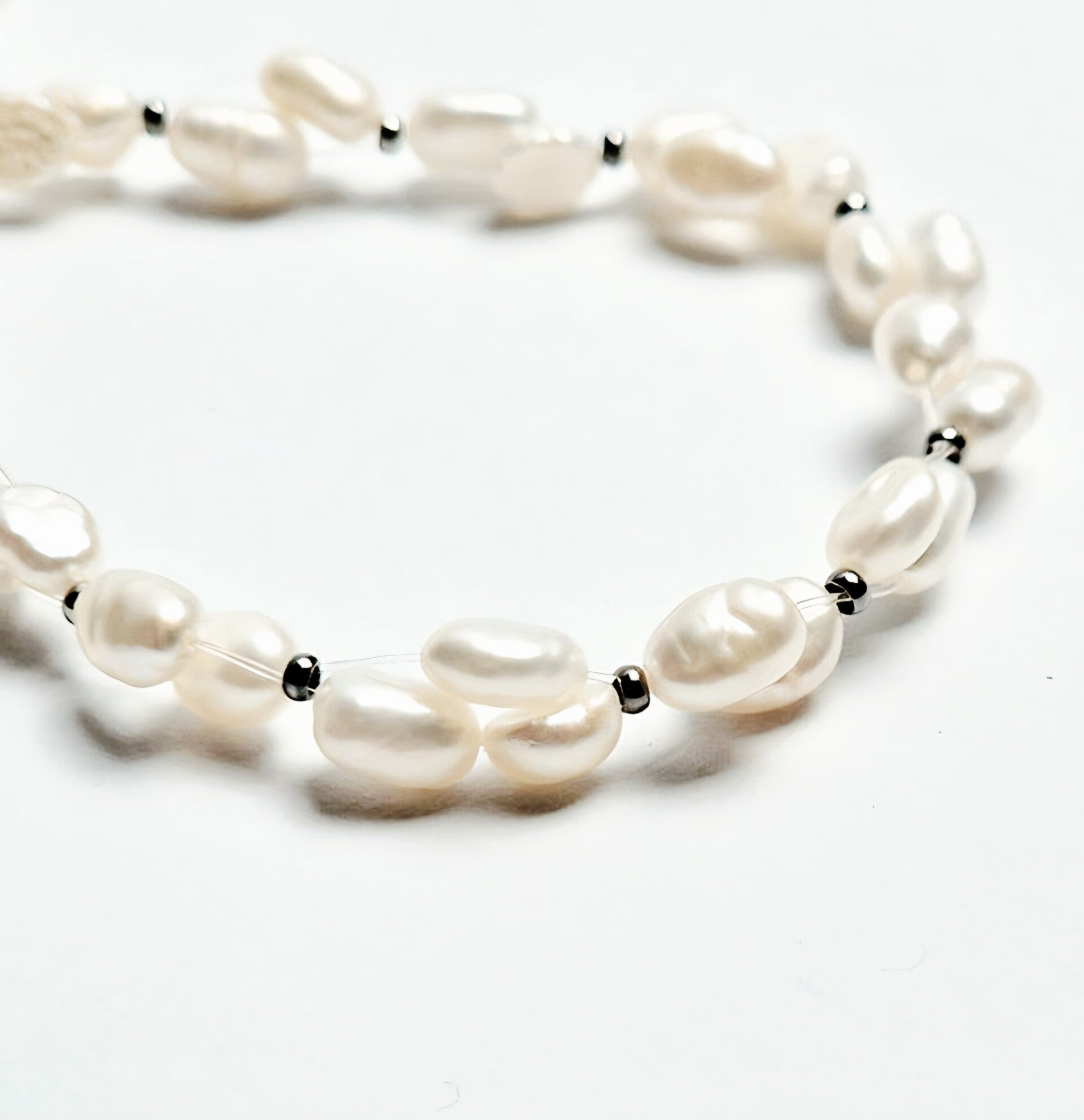 Laat je verleiden door de natuurlijke elegantie van deze handgemaakte ketting met echte zoetwaterparels (Ø 5 mm). De parels worden subtiel afgewisseld met kleine metalen accenten voor een moderne, verfijnde uitstraling. Met een lengte van 42 cm + 7 cm verlenging past de ketting perfect rond de hals – draag haar solo voor een klassieke look of combineer met andere kettingen voor een stijlvolle, gelaagde combinatie.