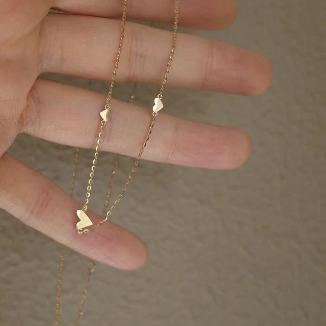 De ketting bestaat uit drie subtiele hartjes die symbool staan voor liefde, verbondenheid en tijdloze schoonheid.