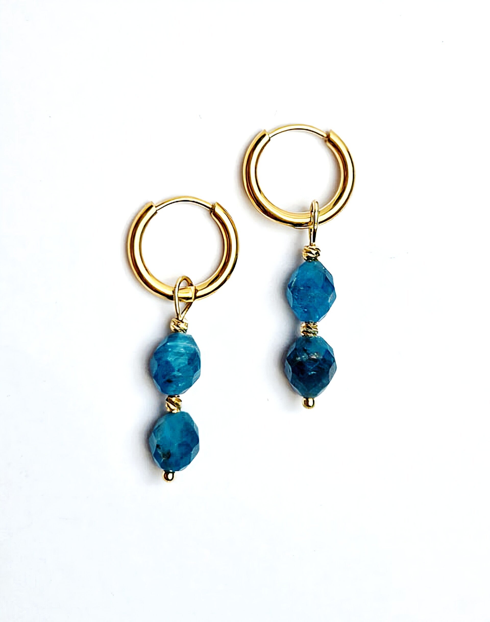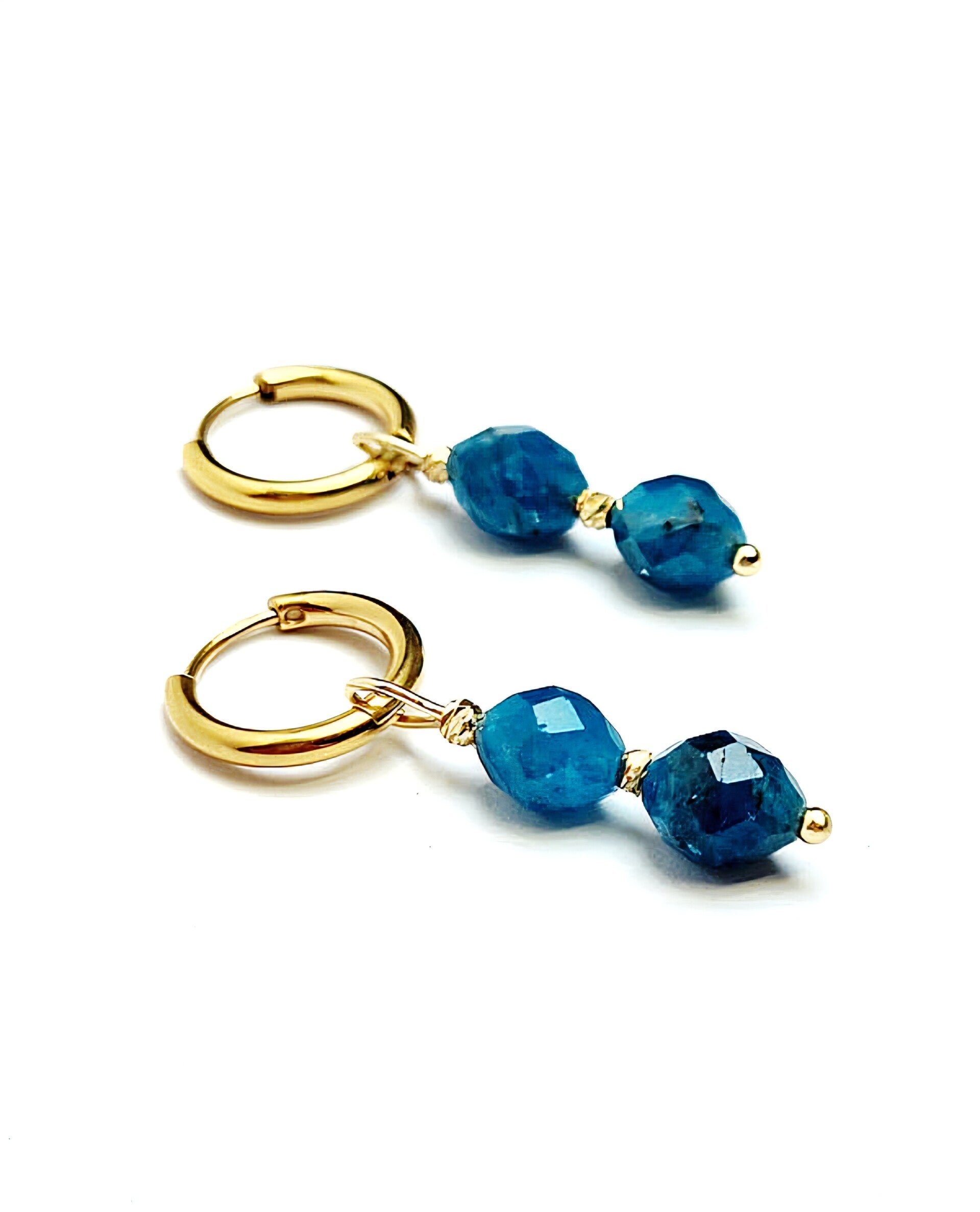 Wat deze oorbellen echt bijzonder maakt, zijn de twee ovaalvormige blauwe apatiet stenen die subtiel bungelen aan de oorringen. De natuurlijke blauwe kleur van apatiet straalt rust, helderheid en positieve energie uit – perfect voor wie houdt van betekenisvolle sieraden met een stijlvol accent.