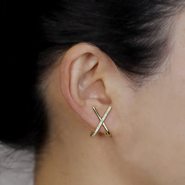 Deze verfijnde X-vormige oorstekers van 925 sterling zilver combineren modern design met de luxe uitstraling van echte diamanten. Ze zijn verkrijgbaar in een geelgoud vergulde of witgoud vergulde afwerking en ingelegd met maar liefst 24 moissanite diamanten (VVS1, D-kleur) die met de hand gezet zijn in een stevige inlay technologie.