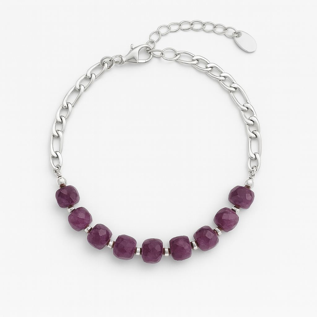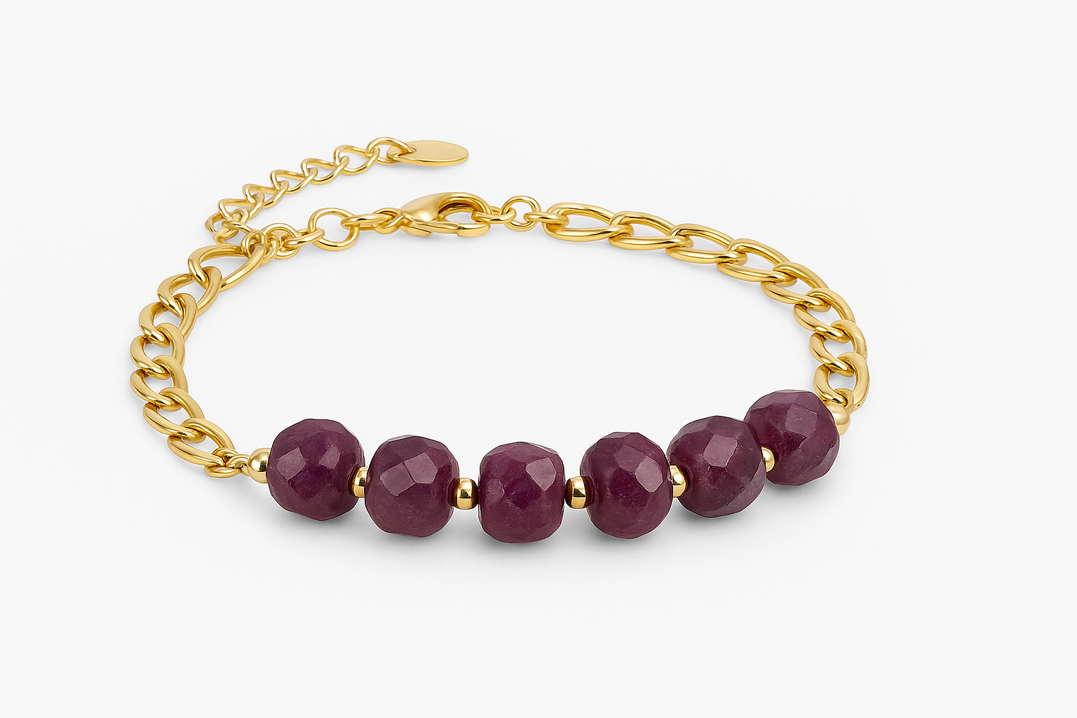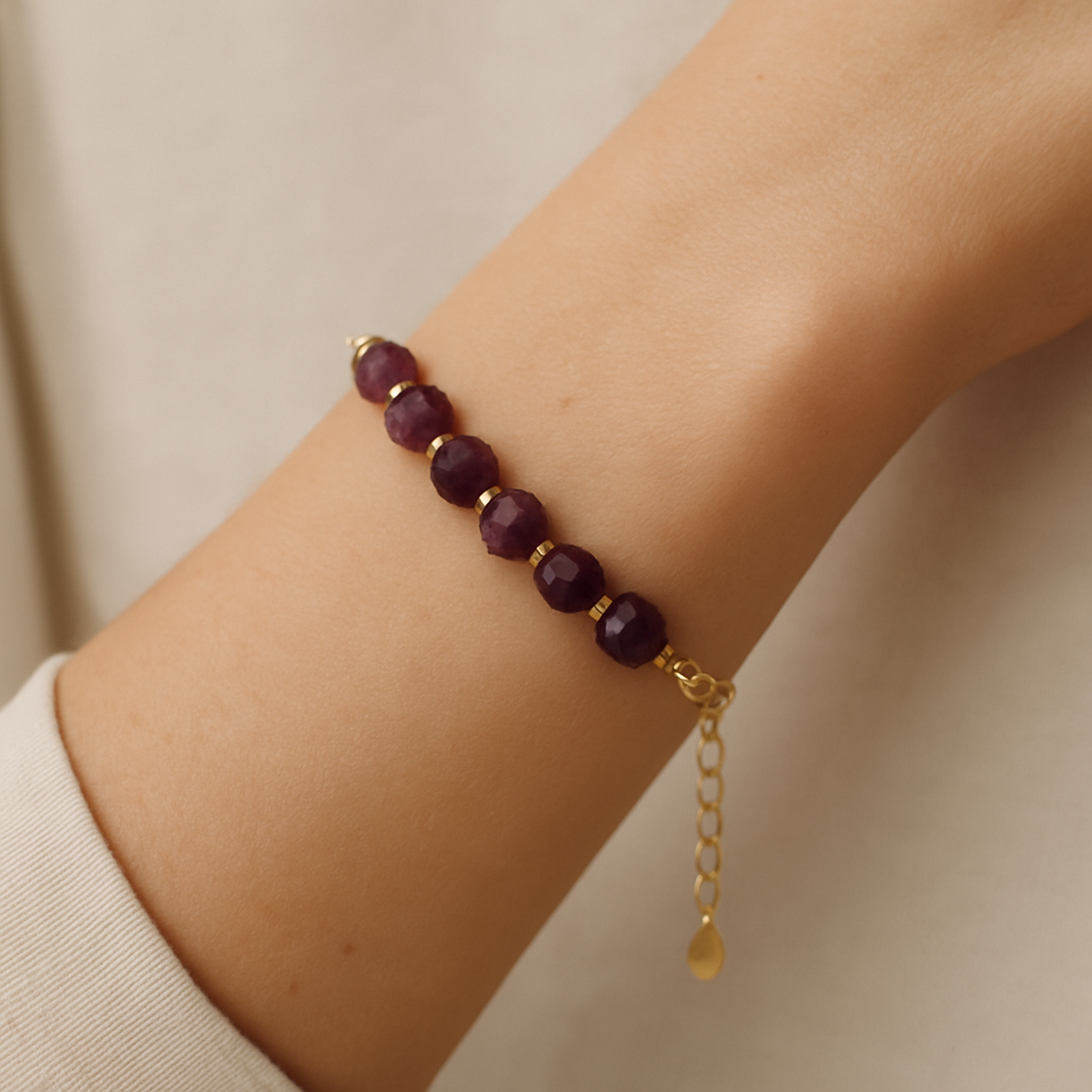 De diep rode paarsachtige granaatstenen zijn zorgvuldig facetgeslepen om het licht op een subtiele manier te vangen, waardoor elke beweging een sprankelende gloed krijgt. De combinatie van goud of zilverkleurige schakels en natuurlijke edelstenen creëert een tijdloze balans tussen luxe en eenvoud.