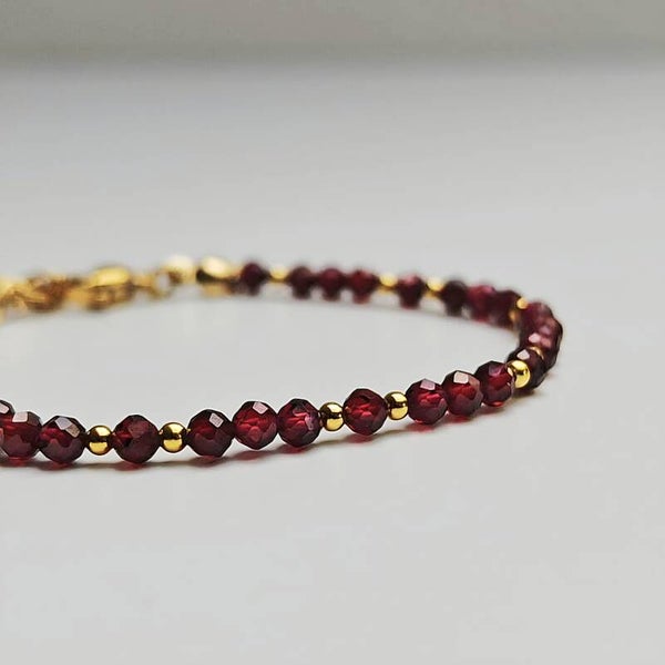 Deze elegante armband met dieprode granaatstenen (4 mm) straalt kracht, warmte en vrouwelijke verfijning uit. De facetgeslepen granaatkralen schitteren subtiel bij elke beweging, terwijl de goud- of zilverkleurige stainless steel details zorgen voor een luxe en tijdloze uitstraling.